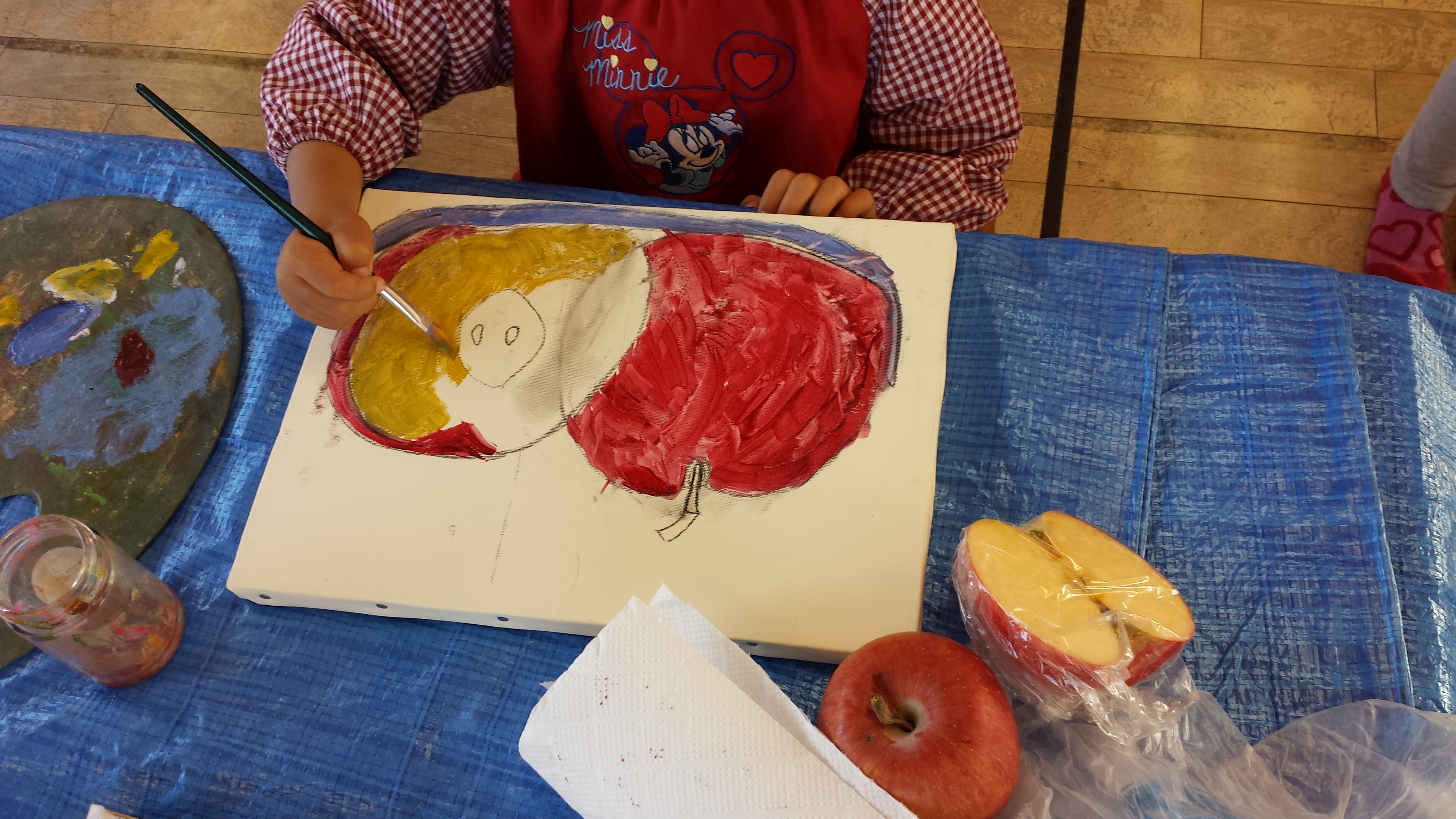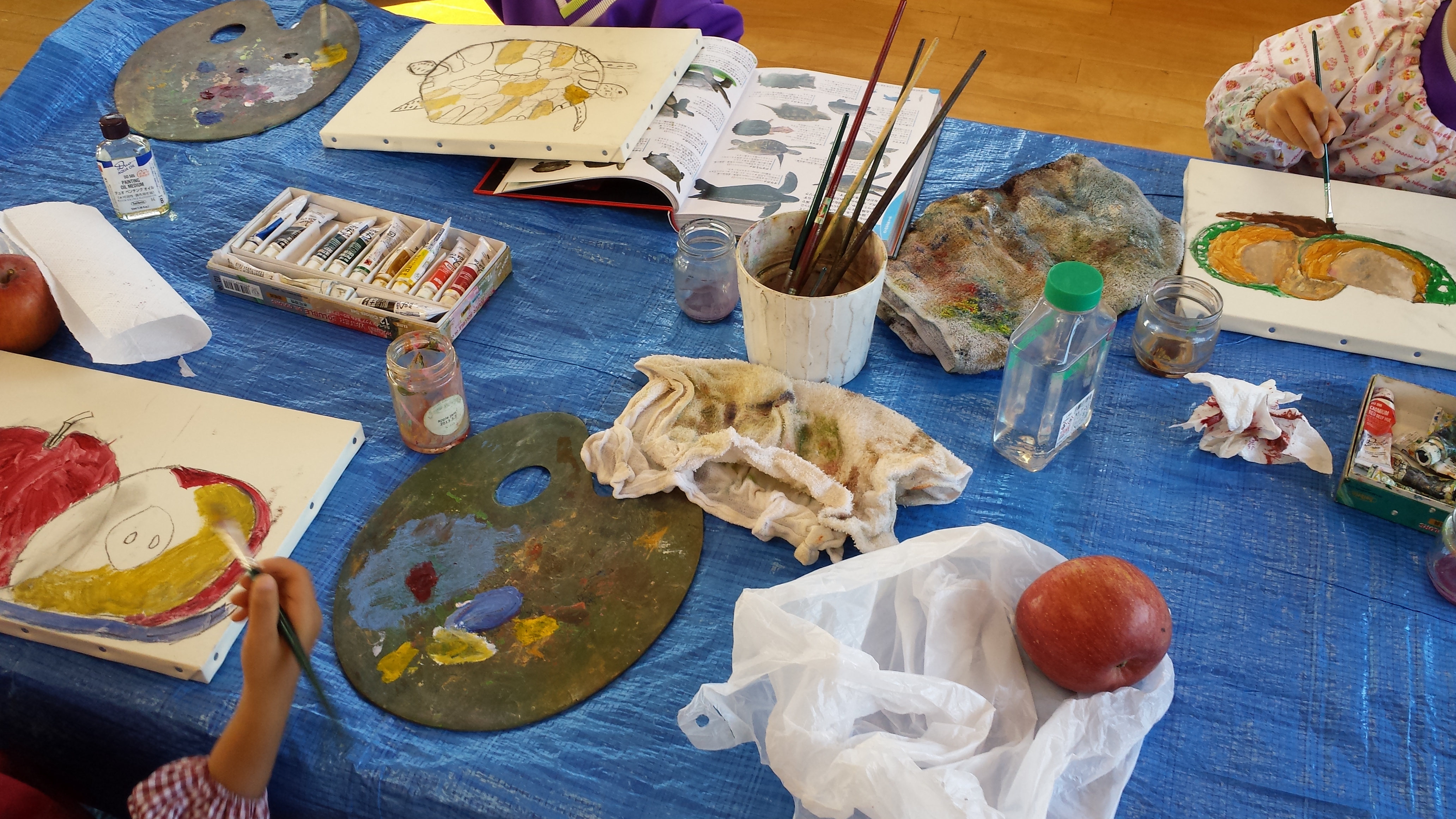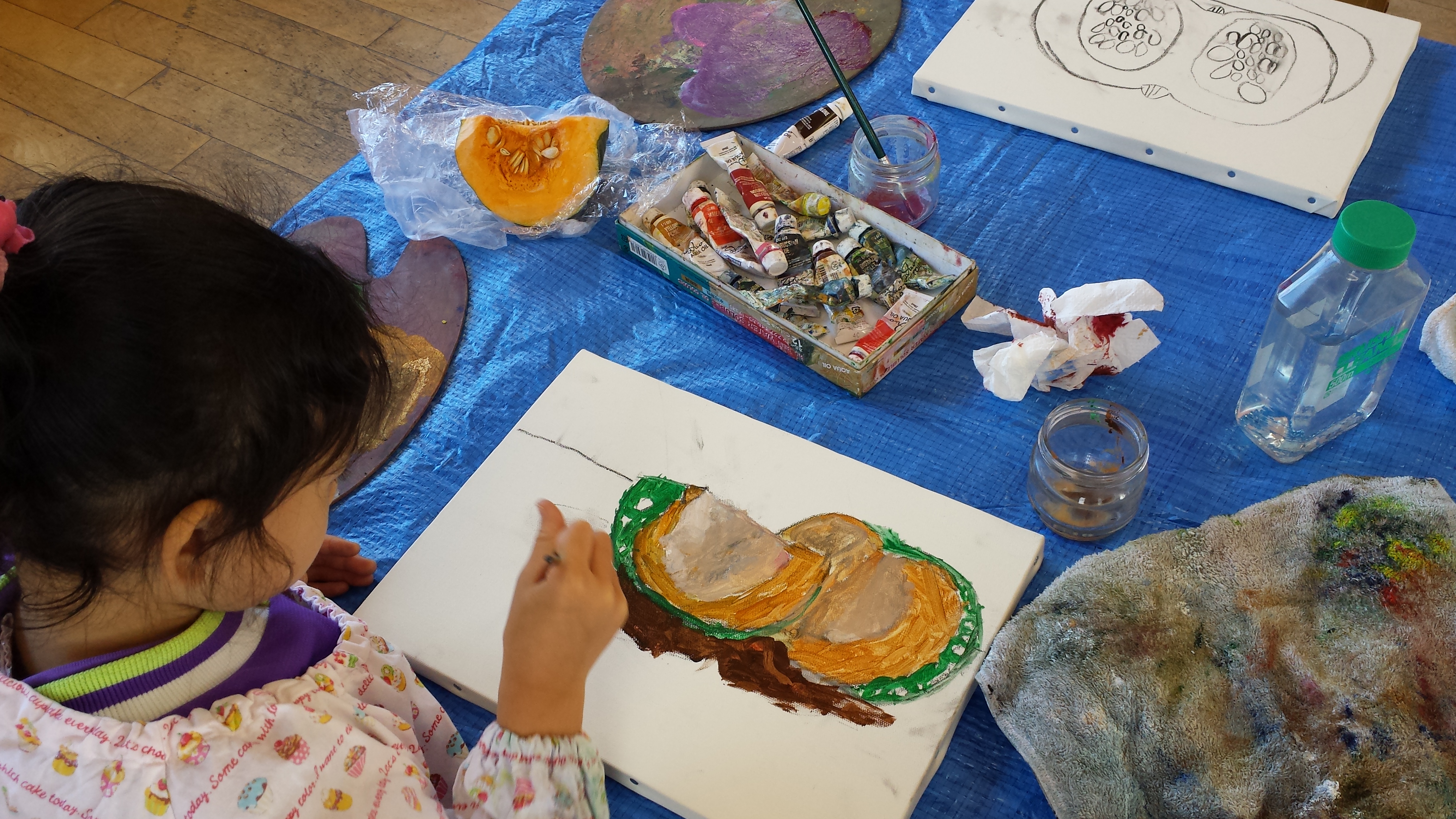 今月のテーマは油絵。家から持って来たかぼちゃやりんごなど実物をじっくり見て丁寧に描き上げていきます。額に入れたら売れるくらいの完成度♪